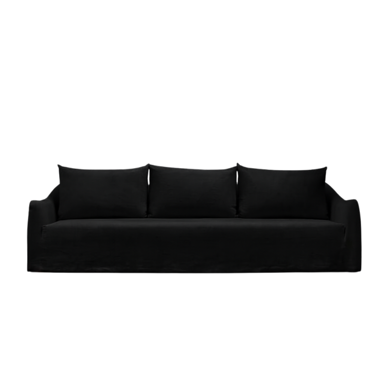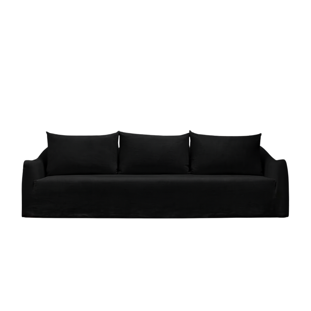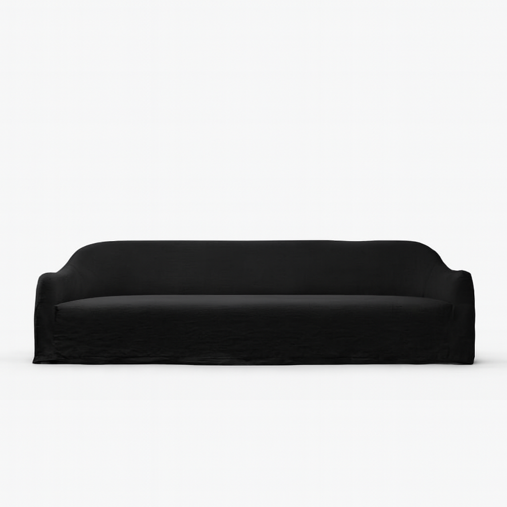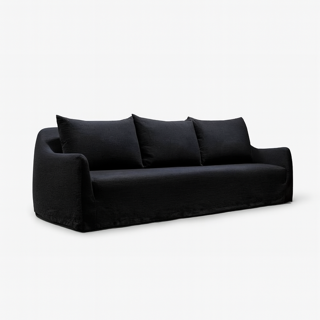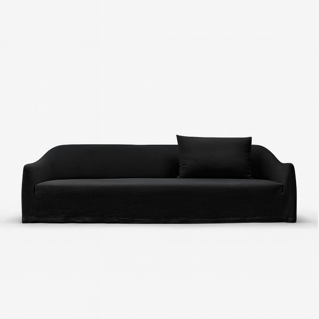 Cloaked in magnificent Obsidian linen, a custom-dyed, deep black that offers a matte, light-absorbing finish. This heavyweight Belgian linen features a tactile, raw texture that achieves a level of high-contrast drama unmatched by standard velvet or leather. The fully-skirted slipcover provides a perfectly tailored, yet relaxed, modern drape.